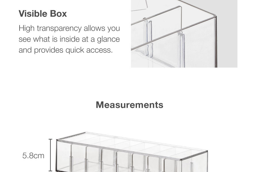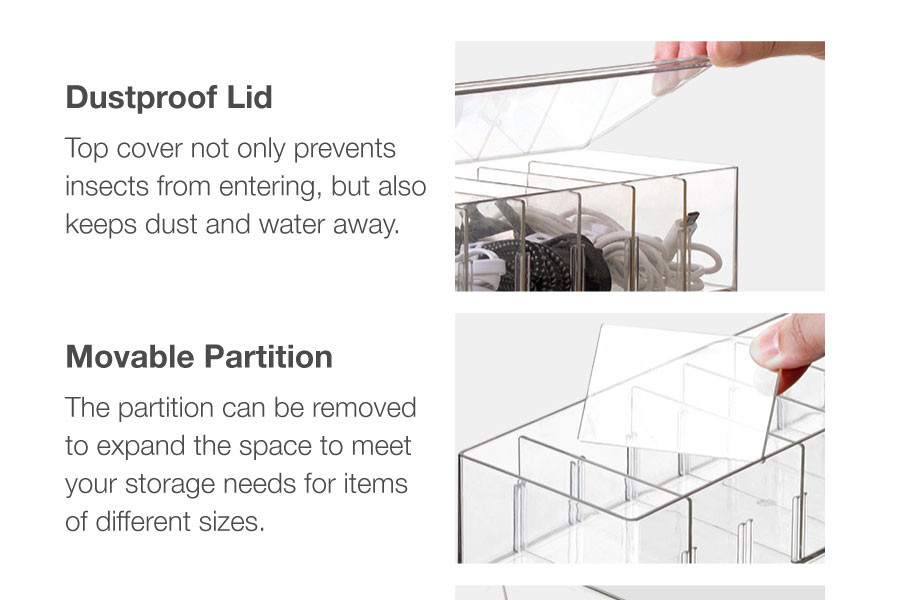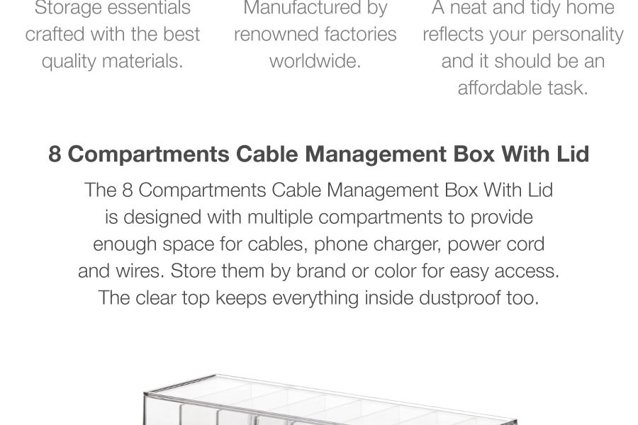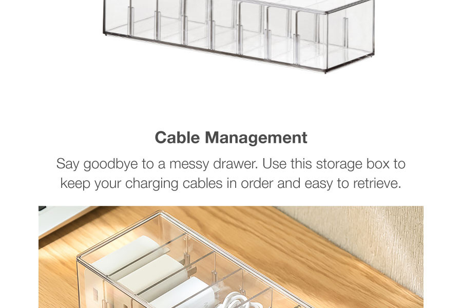 The 8 Compartments Cable Management Box With Lid is designed with multiple compartments to provide enough space for cables, phone charger, power cord and wires。 Store them by brand or color for easy access. The clear top keeps everything inside dustproof too.