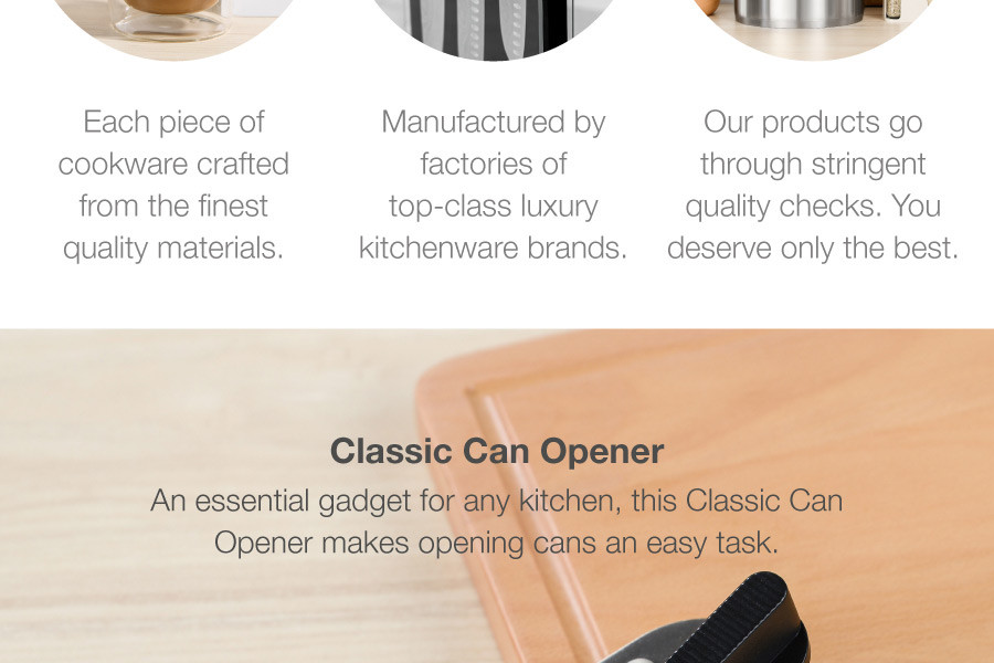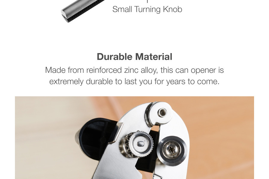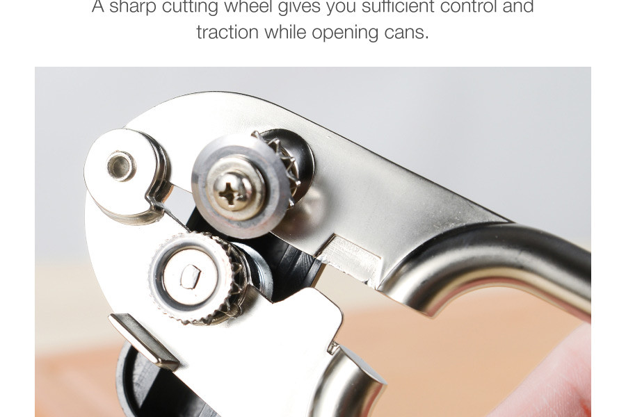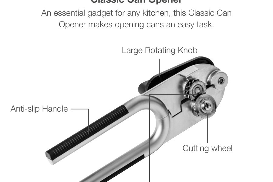 An essential gadget for any kitchen, the Classic Can Opener makes opening cans an easy task. The can opener features a sharp, zinc alloy cutting wheel and comes with ergonomic handles to provide a sure grip when in use. Hand wash with warm water and a mild detergent; rinse and dry immediately.